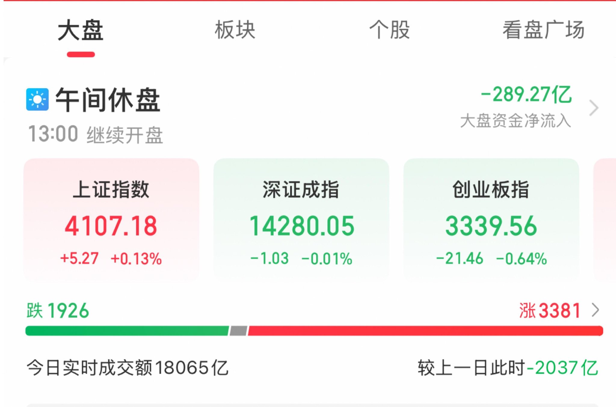 A股三大指数早盘涨跌不一,截至午盘,沪指涨0.13%,深成指跌0.01%,创业板指跌0.64%,北证50指数涨0.32%,沪深京三市半日成交额18065亿元,较上日缩量2037亿元。全市场超3300只个股上涨。