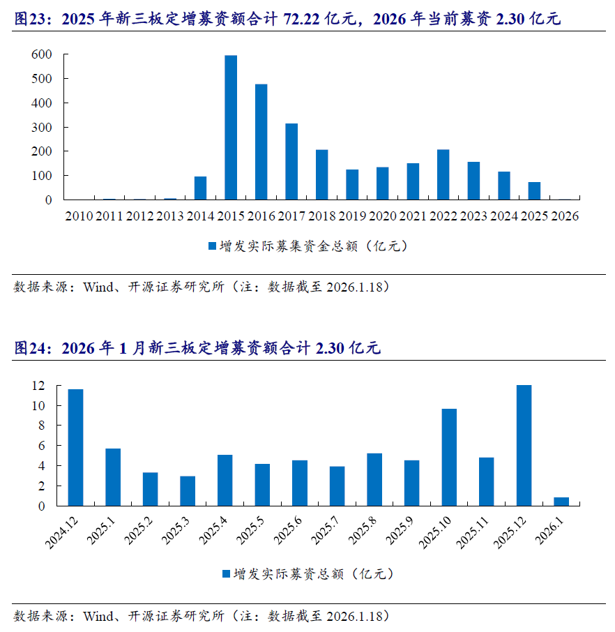定增额度上看,新三板定增为企业带来的募资在2014-2015年间大幅增长,2015年合计定增募集额595.62亿元。随后有所下降,2019年定增募资总额125.03亿元,随着新三板深化改革,定增募资额有所回升,2022年达到207.54亿元。2025全年合计72.22亿元。截至2026年1月18日,2026年新三板定增募资2.30亿元。