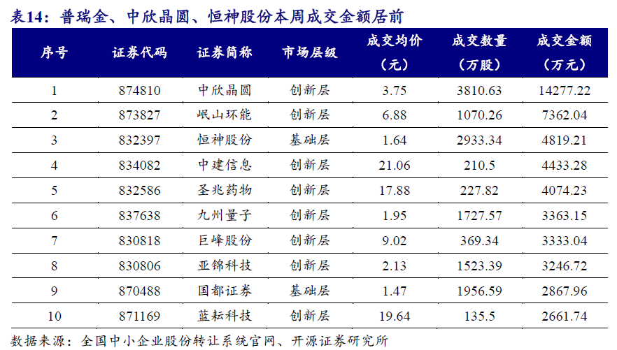 本周成交金额前十名的挂牌公司分别为:中欣晶圆、岷山环能、恒神股份、中建信息、圣兆药物、九州量子、巨峰股份、亚锦科技、国都证券、蓝耘科技。