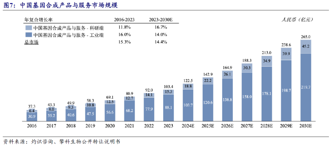 中国的基因合成市场同样可分为科研端和工业端市场,且同样包含寡核苷酸的合成、基因片段的组装、基因组的合成以及合成验证测序的产品与服务。中国基因合成产品与服务的市场规模在的市场规模在2023 年达到了约103.4 亿人民币,预计到2030 年将以约14.4%的年复合增长率至约265.0亿人民币。