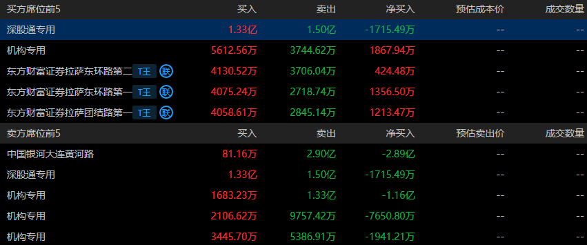 三维通信(002115)今日跌9.98%,成交额46.32亿元,换手率42.44%,盘后龙虎榜数据显示,深股通专用席位买入1.33亿元并卖出1.50亿元,1家机构专用席位净买入1867.94万元,有3家机构专用席位净卖出2.12亿元。中国银河(601881)大连黄河路净卖出2.89亿元。