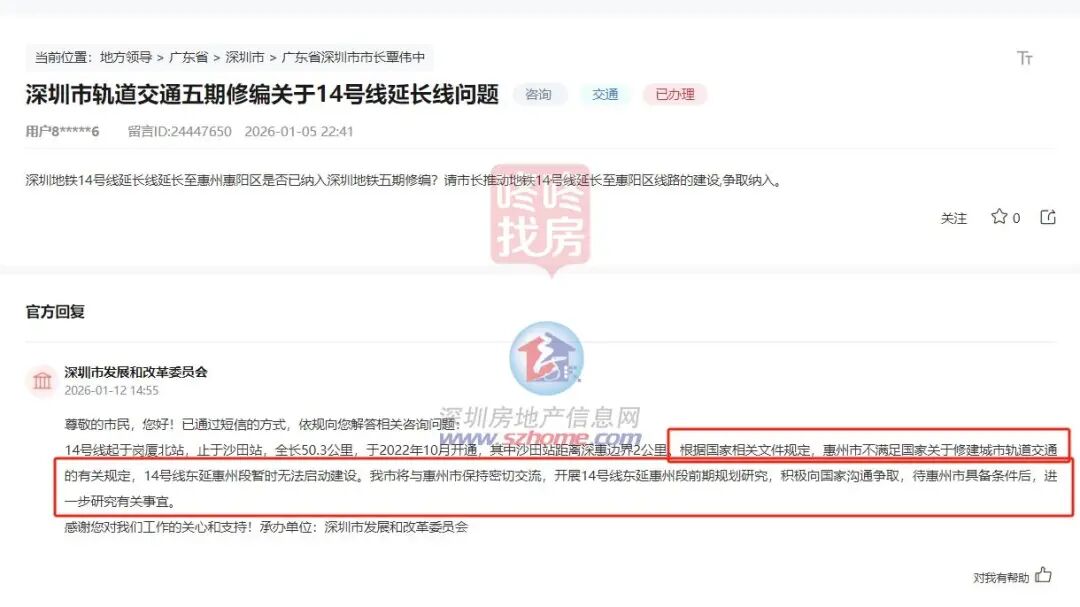 深圳市发展和改革委员会回复称,14号线起于岗厦北站,止于沙田站,全长50.3公里,于2022年10月开通,其中沙田站距离深惠边界2公里。根据国家相关文件规定,惠州市不满足国家关于修建城市轨道交通的有关规定,14号线东延惠州段暂时无法启动建设。