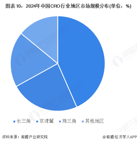 从2024年中国CRO行业的区域市场规模数据来看,长三角以43%左右的占比占据绝对主导地位,京津冀约为23%、珠三角约为19%,构成核心次级布局区域,三大区域合计包揽了超85%的市场份额,仅余14.1%的份额分散在其他地区,凸显出国内CRO行业向三大核心区域集中的发展格局。