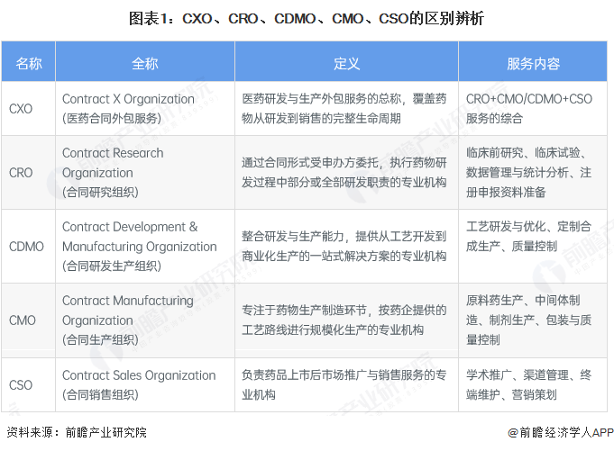 为了更好地理解CRO的含义,在这里对CXO、CRO、CDMO、CMO、CSO的全称、定义、和服务内容进行多方位对比,以区别其他混淆概念。这些细分产业通过专业化分工,分别承接药企研发、生产、销售等非核心环节,帮助药企降低成本、缩短周期、分散风险,共同构成了支撑医药产业高效发展的外包服务生态。