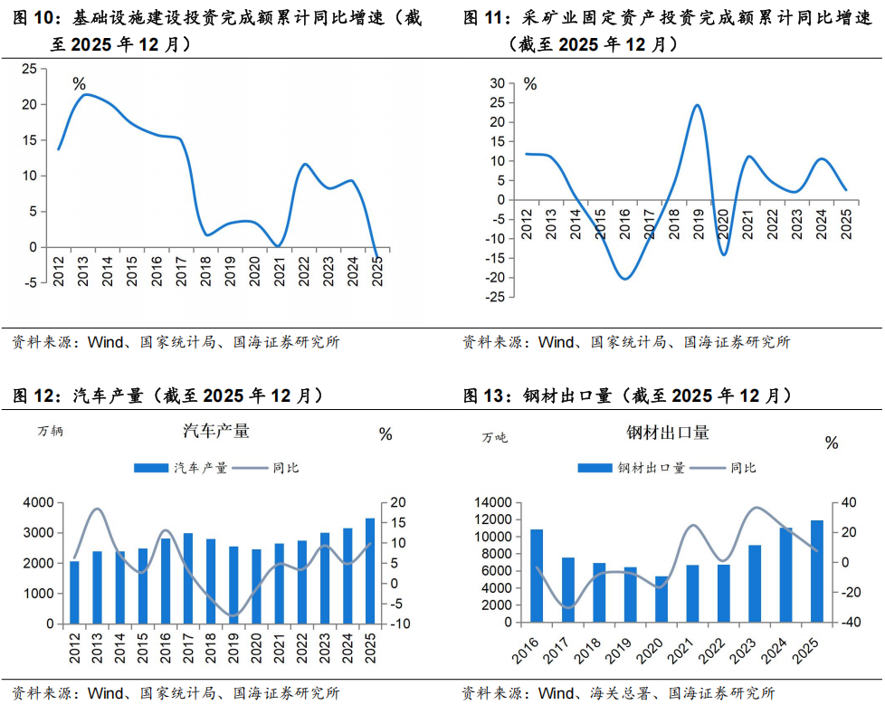 从下游来看,1-12月相较1-11月,钢材出口提升明显,基建、制造业投资均有放缓,地产依然低迷。2025年1-12月基建投资完成额同比-1.48 %,增速较1-11月放缓1.61 pct,房地产开发投资完成额1-12月同比-17.2%,降幅较1-11月扩大1.3pct,房屋新开工面积1-12月同比-20.4%,降幅较1-11月放缓0.1pct。此外,2025年1-12月,制造业投资同比+0.6%,增速较1-11月放缓1.3pct,钢材出口1-12月同比+7.5%,增速较1-11月提高0.8pct。
