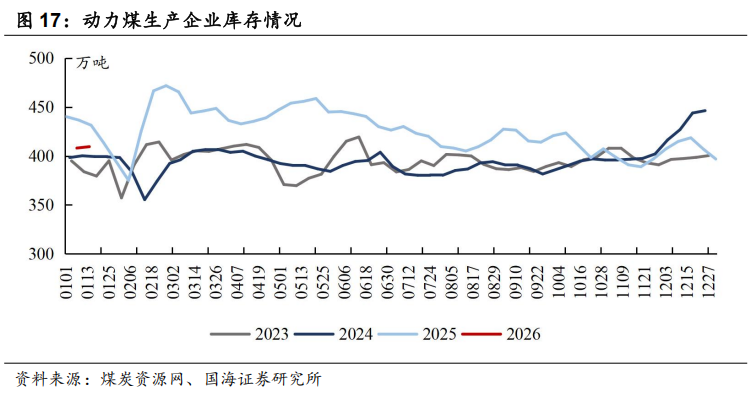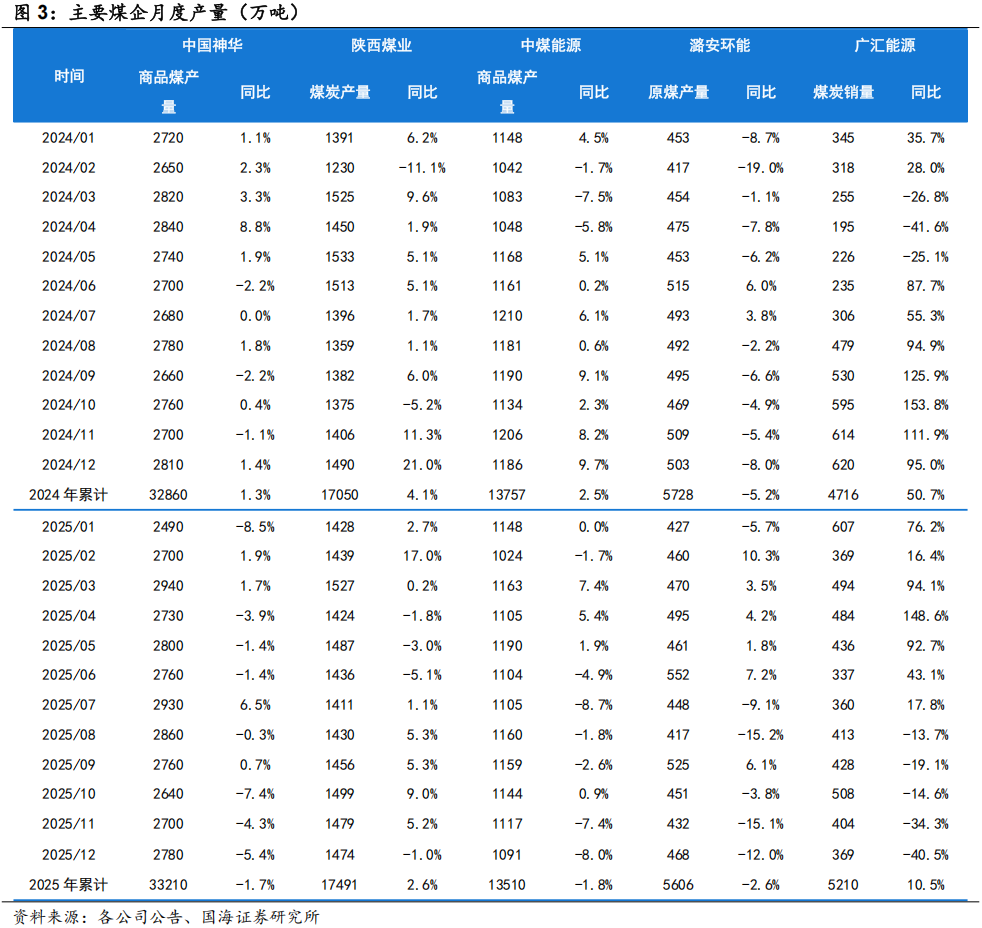 样本大型煤企12月煤炭生产同比均有收紧。我们以中国神华、陕西煤业、中煤能源、潞安环能为样本。2025年12月,中国神华商品煤产量为2780万吨,同比-5.4%;陕西煤业煤炭产量为1474万吨,同比-1.0%;中煤能源商品煤产量为1091万吨,同比-8.0%;潞安环能原煤产量为468万吨,同比-12.0%。整体看,样本公司煤炭产量同比均有收紧。