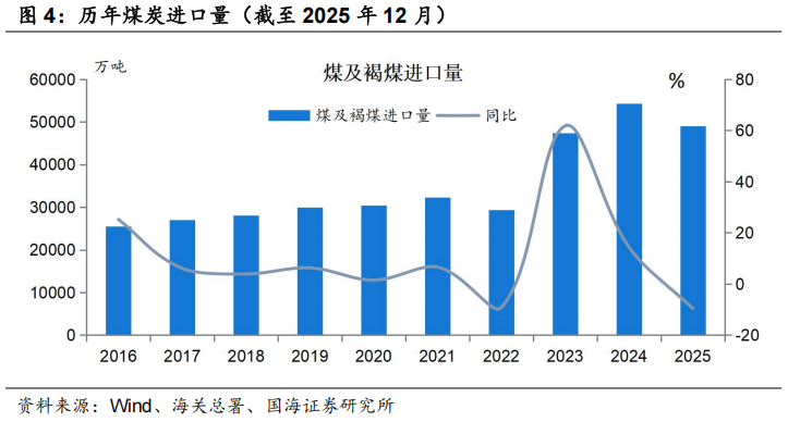 生产方面:12月原煤生产同比-1.0%,降幅较11月放大0.5pct,与年底生产任务完成、煤矿停减产有关。2025年12月,规上工业原煤产量4.4亿吨,同比下降1.0%,降幅相较11月放大0.5pct,主要系随着临近年底,因完成年度生产任务而停减产的煤矿增多所致。2025年12月,规上工业原煤日均产量为1,410万吨,月度环比减少12.9万吨/天,同比减少5.9万吨/天。1-12月,规上工业原煤产量48.3亿吨,同比增长1.2%,累计同比增速相较1-11月降低0.2pct。样本大型煤企12月煤炭生产同比均有收紧。我们以中国神华、陕西煤业、中煤能源、潞安环能为样本。2025年12月,中国神华商品煤产量为2780万吨,同比-5.4%;陕西煤业煤炭产量为1474万吨,同比-1.0%;中煤能源商品煤产量为1091万吨,同比-8.0%;潞安环能原煤产量为468万吨,同比-12.0%。整体看,样本公司煤炭产量同比均有收紧。进口方面:12月煤炭进口同比+11.90%,增幅较11月放大31.8pct,增幅超市场预期与进口煤性价比、印尼征收出口关税预期下海外供应商抢运等因素有关。2025年12月,我国进口煤炭5,860万吨,同比+11.90 %,增幅较11月放大31.8pct,创历史新高,主要系临近年底国内供应阶段性收紧之下,仍存价格优势的进口煤具补充效应,且印尼2026年征收出口关税预期下海外供应商加紧抢运所致。2025年1-12月煤炭进口4.9亿吨,同比-9.60%。按照2025年12月国内产量同比增速-1.0%以及进口量同比增速+11.90 %来计算,2025年12月国内煤炭供应同比增速为+0.5%(供应增速测算未考虑热值变化),增幅较11月放大2.8pct。