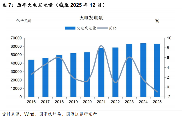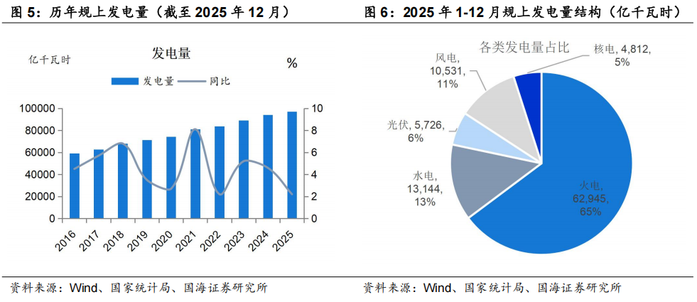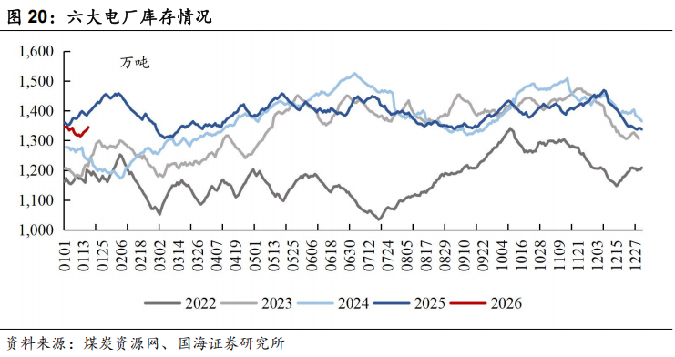 需求端:12月火电同比下降,化工、焦炭依旧贡献正增长;整体需求同比降幅受火电降幅收窄影响而较上月收窄火电:12月规上工业火电同比-3.2%,同比降幅较11月收窄1.0pct。规上工业电力生产保持增长。12月份,规上工业发电量8586亿千瓦时,同比增长0.1%;日均发电量277.0亿千瓦时。1-12月份,规上工业发电量97159亿千瓦时,同比增长2.2%。分品种看,12月份,规上工业火电降幅收窄,水电、核电、风电、太阳能发电增速放缓。其中,规上工业火电同比下降3.2%,降幅比11月份收窄1.0个百分点;规上工业水电增长4.1%,增速比11月份放缓13.0个百分点;规上工业核电增长3.1%,增速比11月份放缓1.6个百分点;规上工业风电增长8.9%,增速比11月份放缓13.1个百分点;规上工业太阳能发电增长18.2%,增速比11月份放缓5.2个百分点。1-12月,规上工业火电累计同比下降1.0%,降幅比1-11月扩大0.3个百分点;规上工业水电累计同比增长2.8%,增速比1-11月放大0.1个百分点;规上工业太阳能发电累计同比增长24.4%,增速比1-11月放缓0.4个百分点;规上工业风电累计同比增长9.7%,增速比1-11月扩大1.0个百分点;规上工业核电累计同比增长7.7%,增速比1-11月放缓0.4个百分点。钢铁:12月生铁、焦炭产量表现分化,分别同比-9.9%/+1.9%,同比增速分别-1.2pct/-0.4pct。2025年12月,我国实现生铁产量6,072万吨,同比-9.9%,降幅较上月扩大1.2pct;焦炭产量4,274万吨,同比+1.9%,增幅较上月放缓0.4pct。2025年1-12月,我国实现生铁累计产量83,604万吨,同比-3.0%;焦炭产量50,412万吨,同比+2.9%。从下游来看,1-12月相较1-11月,钢材出口提升明显,基建、制造业投资均有放缓,地产依然低迷。2025年1-12月基建投资完成额同比-1.48 %,增速较1-11月放缓1.61 pct,房地产开发投资完成额1-12月同比-17.2%,降幅较1-11月扩大1.3pct,房屋新开工面积1-12月同比-20.4%,降幅较1-11月放缓0.1pct。此外,2025年1-12月,制造业投资同比+0.6%,增速较1-11月放缓1.3pct,钢材出口1-12月同比+7.5%,增速较1-11月提高0.8pct。建材化工:水泥、化工分化,12月水泥产量/化工耗煤同比-6.6%/+8.4%,较11月增速+1.6pct/+0.19pct。2025年12月,全国水泥产量1.44亿吨,同比-6.6%,同比降幅相较11月减缓1.6pct;化工行业合计耗煤(甲醇、合成氨、PVC、纯碱、乙二醇)2932.16万吨,同比+8.41%,同比增速较11月放大0.19pct;2025年1-12月,全国水泥产量16.93亿吨,同比-6.90%,同比降幅相较1-11月持平;化工行业合计耗煤(甲醇、合成氨、PVC、纯碱、乙二醇)36219.49万吨,同比+11.54%,同比增速较1-11月放缓0.28pct。按照煤炭工业协会数据,若按照2024年电力、钢铁、化工、建材在煤炭下游需求中占比分别为62%、15%、8%、8%计算,我们估算2025年12月四大行业带动煤炭消费同比-1.5%,降幅较11月收窄0.7pct。