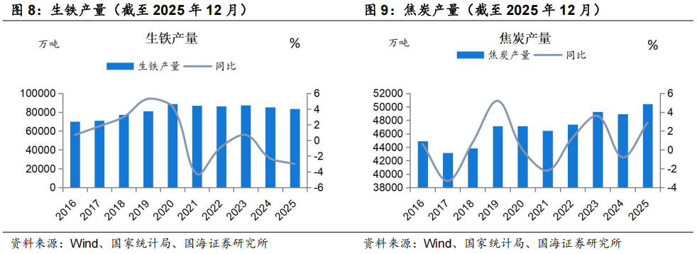2025年12月,我国实现生铁产量6,072万吨,同比-9.9%,降幅较上月扩大1.2pct;焦炭产量4,274万吨,同比+1.9%,增幅较上月放缓0.4pct。2025年1-12月,我国实现生铁累计产量83,604万吨,同比-3.0%;焦炭产量50,412万吨,同比+2.9%。