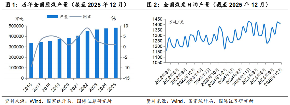 12月原煤生产同比-1.0%,降幅较11月放大0.5pct,与年底生产任务完成、煤矿停减产有关。2025年12月,规上工业原煤产量4.4亿吨,同比下降1.0%,降幅相较11月放大0.5pct,主要系随着临近年底,因完成年度生产任务而停减产的煤矿增多所致。2025年12月,规上工业原煤日均产量为1,410万吨,月度环比减少12.9万吨/天,同比减少5.9万吨/天。1-12月,规上工业原煤产量48.3亿吨,同比增长1.2%,累计同比增速相较1-11月降低0.2pct。