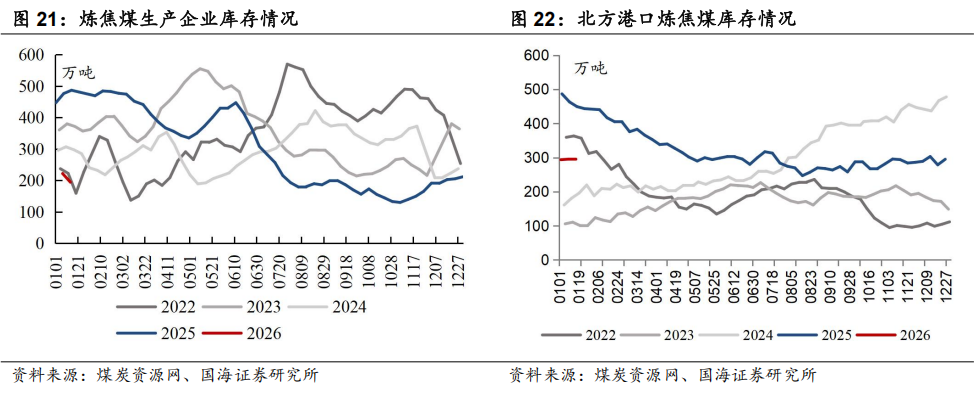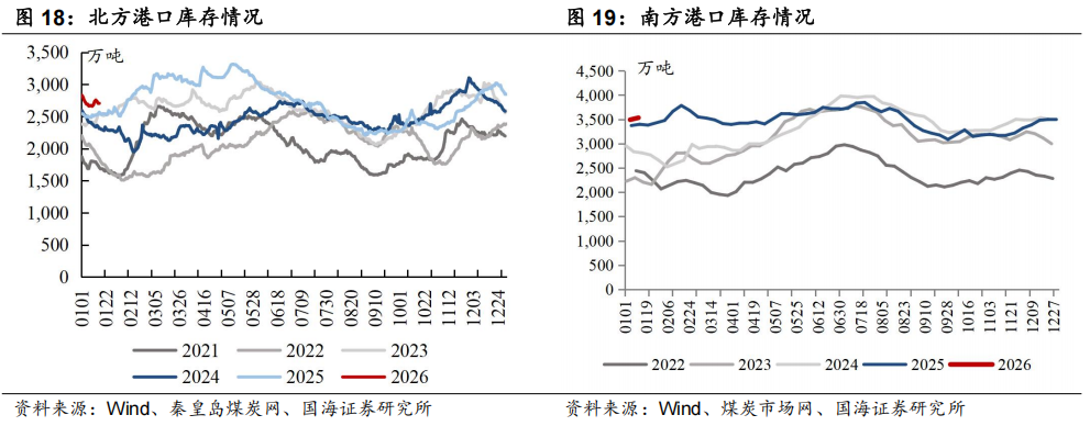 库存:12月动力煤港口库存提升、焦煤上游矿山库存提升动力煤库存:港口库存提升。2025年12月末,动力煤生产企业库存较月初(下同)降低10.3万吨至396.9万吨,部分在产性价比高的煤矿销售略有好转;北方港口动力煤库存提升130.8万吨至2,840.6万吨,同比提升286万吨,港口调入因贸易商拉运积极性有限而减少,港口调出亦受电厂日耗偏低而降低,整体调入高于调出;六大电厂库存降低115.5万吨至1337.5万吨。炼焦煤库存:上游库存提升。2025年12月底较月初,炼焦煤生产企业库存环比上升20.22万吨至211.74万吨,仍处同期较低水平;北港焦煤库存环比上升6万吨至295.05万吨;焦化厂炼焦煤库存上升6.11万吨至295.05万吨;钢厂炼焦煤库存上升3.21万吨至528.68万吨。