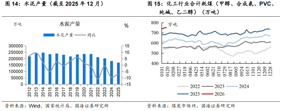 2.3、建材及化工:水泥、化工分化,12月水泥产量/化工耗煤同比-6.6%/+8.4%,较11月增速+1.6pct/+0.19pct