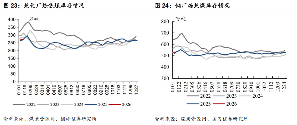 2025年12月底较月初,炼焦煤生产企业库存环比上升20.22万吨至211.74万吨,仍处同期较低水平;北港焦煤库存环比上升6万吨至295.05万吨;焦化厂炼焦煤库存上升6.11万吨至295.05万吨;钢厂炼焦煤库存上升3.21万吨至528.68万吨。