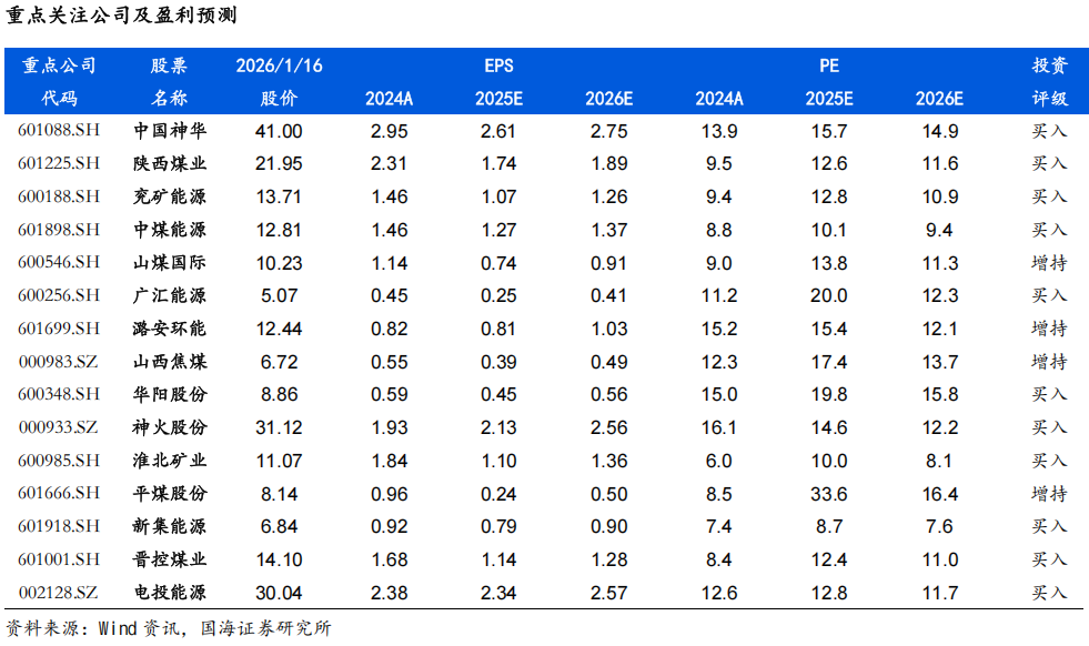 美国关税新政落地对市场情绪构成一定冲击,市场寻求稳健性资产,煤炭高股息、现金奶牛的投资价值属性值得关注。同时2025年国家能源集团、山东能源集团、中国中煤能源集团等多家煤炭央国企对旗下上市公司启动增持与资产注入计划,亦释放利好,彰显煤企发展信心、增厚企业成长性与稳定性。从大方向来看,煤炭开采行业供应端约束逻辑未变,需求端可能阶段性起伏波动,价格亦呈现一定震荡和动态再平衡。复盘行业30年经验,煤炭价格呈现震荡向上趋势,背后的驱动因素包括人工成本刚性上涨,安全投入、环保投入的持续加大,原材料动力等大宗商品涨价,以及地方政府加大征税力度等,从行业发展大趋势来看,上述驱动因素依然存在,煤价长期内仍然有上涨的诉求,过程可能是曲折的,但是方向应该是明确的。头部煤炭企业资产质量高,账上现金流充沛,呈现“高盈利、高现金流、高壁垒、高分红、高安全边际”五高特征。建议把握低位煤炭板块的价值属性,维持煤炭开采行业“推荐”评级。重点关注:(1)稳健型标的:中国神华、陕西煤业、中煤能源、电投能源、新集能源。(2)动力煤弹性较大标的:兖矿能源、晋控煤业、广汇能源、力量发展。(3)焦煤弹性较大标的:神火股份、淮北矿业、平煤股份、潞安环能、山西焦煤供给端,12月生产、进口同比分化,整体供给较11月提升。12月原煤产量4.4亿吨,同比下降1.0%,降幅相较11月扩大0.5pct,煤炭进口同比+11.9%,降幅较11月放大31.8pct,整体看供给同比上升。需求端,12月整体需求下滑,主要系火电下滑拖累,化工、冶金仍录得正贡献。12月规上火电发电同比-3.2%,降幅较11月收窄1.0pct;化工耗煤同比+8.41%,同比增速较11月扩大0.19pct,焦炭产量同比+1.90%,同比增速较11月收窄0.4pct。库存端,北港库存累高,12月北方港口动力煤库存提升130.8万吨至2,840.6万吨,同比提升286万吨。整体来看,12月供需偏宽松,港口库存同比偏高,煤价环比下行,12月秦皇岛5500大卡港口煤价均价731元/吨,环比11月下降90元/吨。展望后续,春节前供应仍有趋紧预期,需求端寒潮天气即将来临叠加春节前补库预期,供需有望改善,动力煤价格存在支撑。中期维度来看,保供产能政策是否有变化,对行业供需平衡表或将产生较大影响。