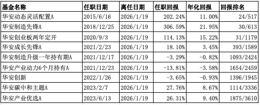 华安动态灵活配置A是他在华安基金管理的首只产品,截至卸任,任职回报(2015年6月16日至2026年1月19日)为202.24%。同时,他掌舵的华安制造先锋A、华安创业两年定开任职回报同样翻倍,分别为306.59%、114.13%。
