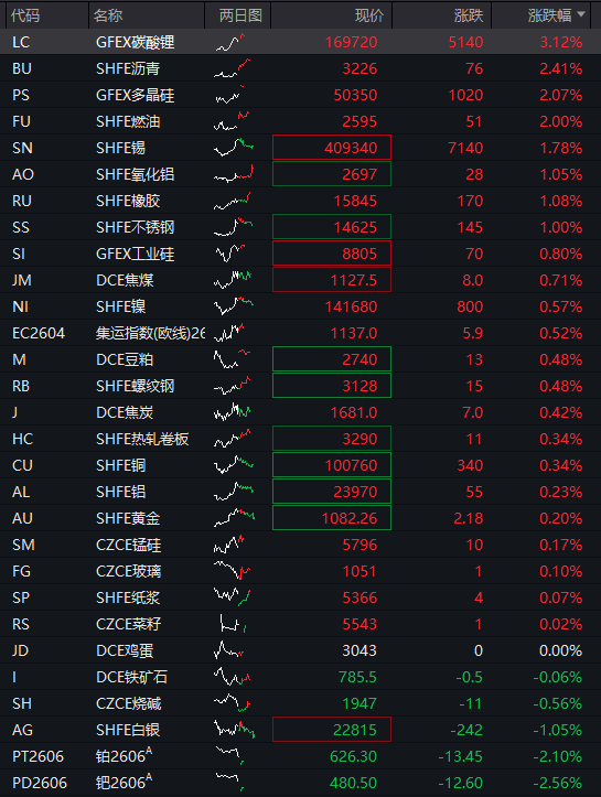 商品:国内商品期货普涨,截至发稿,碳酸锂涨超3%,沥青、多晶硅、燃油涨2%,沪锡、氧化铝、橡胶、不锈钢涨1%,工业硅、焦煤、沪镍、集运指数、豆粕、螺纹钢、焦炭、热轧卷板、沪铜、沪铝、沪金、锰硅、玻璃、纸浆、菜籽等走高,铁矿石、烧碱下跌,沪银跌1%,铂金、钯金跌超2%。