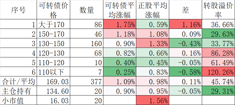 377只可转债平均上涨1.09%,对应正股平均上涨0.95%。我的主仓20只可转债平均上涨0.90%,对应正股平均上涨0.95%。