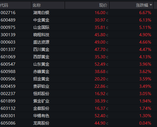 贵金属概念反复走强,白银有色4连板,豫光金铅、中国黄金、四川黄金、盛达资源、兴业银锡等涨幅靠前。