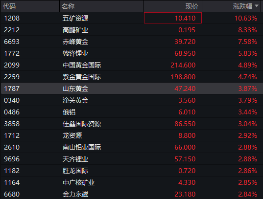 港股有色金属股冲高,五矿资源涨近9%,赤峰黄金涨超7%,紫金黄金国际涨超5%,赣锋锂业涨近5%,山东黄金涨近4%。