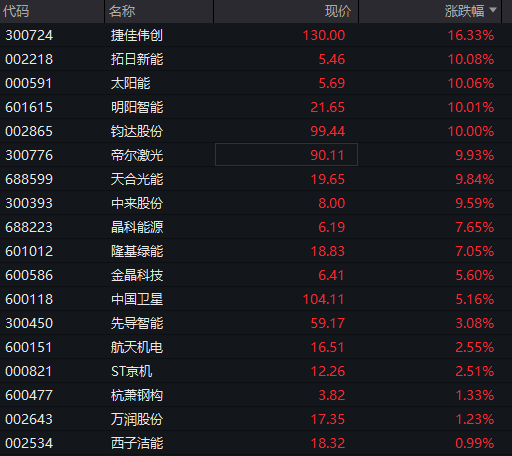 贵金属概念反复走强,白银有色4连板,豫光金铅、中国黄金、四川黄金、盛达资源、兴业银锡等涨幅靠前。光伏概念全线爆发,太空光伏方向领涨,钧达股份2连板,协鑫集成、金辰股份、明阳智能、拓日新能等多股涨停,连城数控、迈为股份、东方日升等涨超10%。