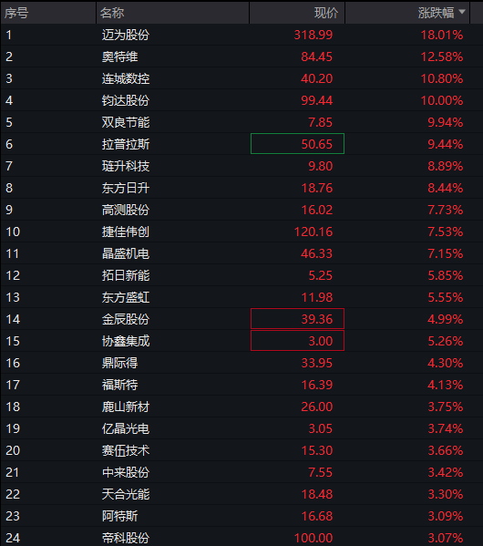 光伏概念股全面爆发,光伏屋顶、BC电池、HJT电池、光伏玻璃、钙钛矿电池、硅能源等方向纷纷大涨,迈威股份、奥特维20CM涨停,捷佳伟创、晶盛机电、天河光能等跟涨。