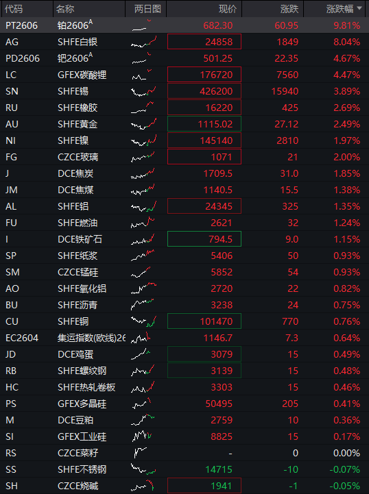 商品:国内商品期货普涨,截至发稿,铂金涨9.8%,沪银涨8%,钯金、碳酸锂涨超4%,沪锡、橡胶、沪金均涨超2%,沪镍、玻璃、焦炭、焦煤、沪铝、燃油、铁矿石涨超1%,纸浆、锰硅、氧化铝、沥青、沪铜、集运指数、鸡蛋、螺纹钢、热轧卷板、多晶硅、豆粕等纷纷上涨。