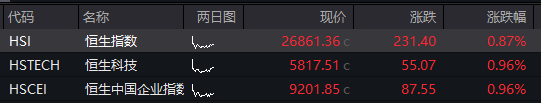 恒指高开0.87%,报26861.36点;恒生科技指数高开0.96%。阿里巴巴涨3.9%,京东集团、阿里健康涨超2%。