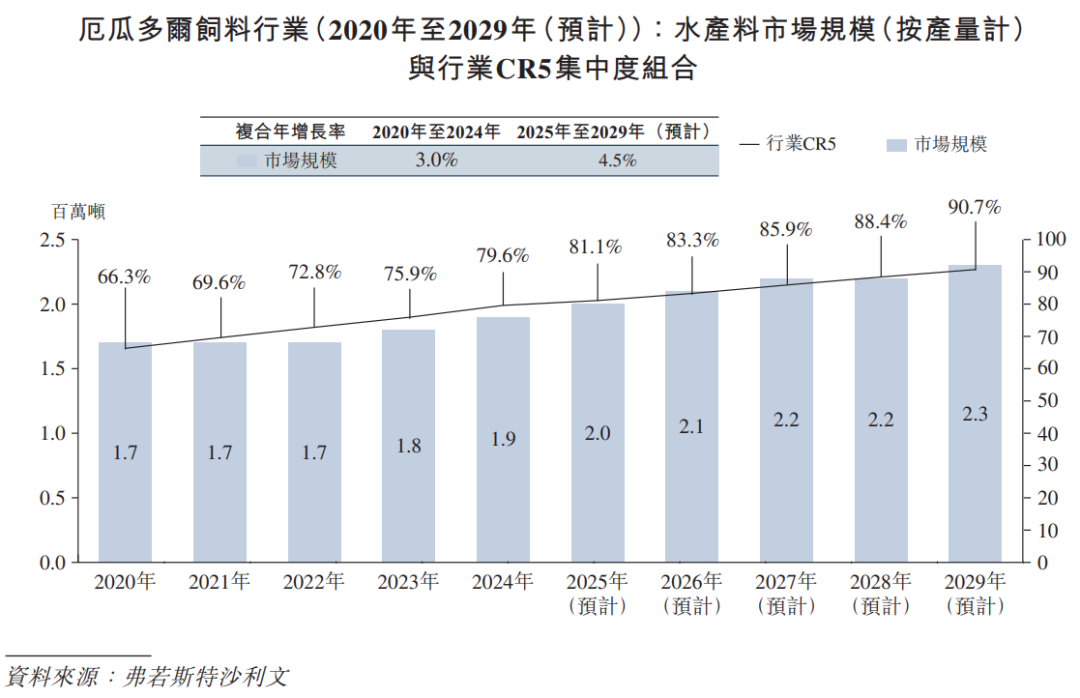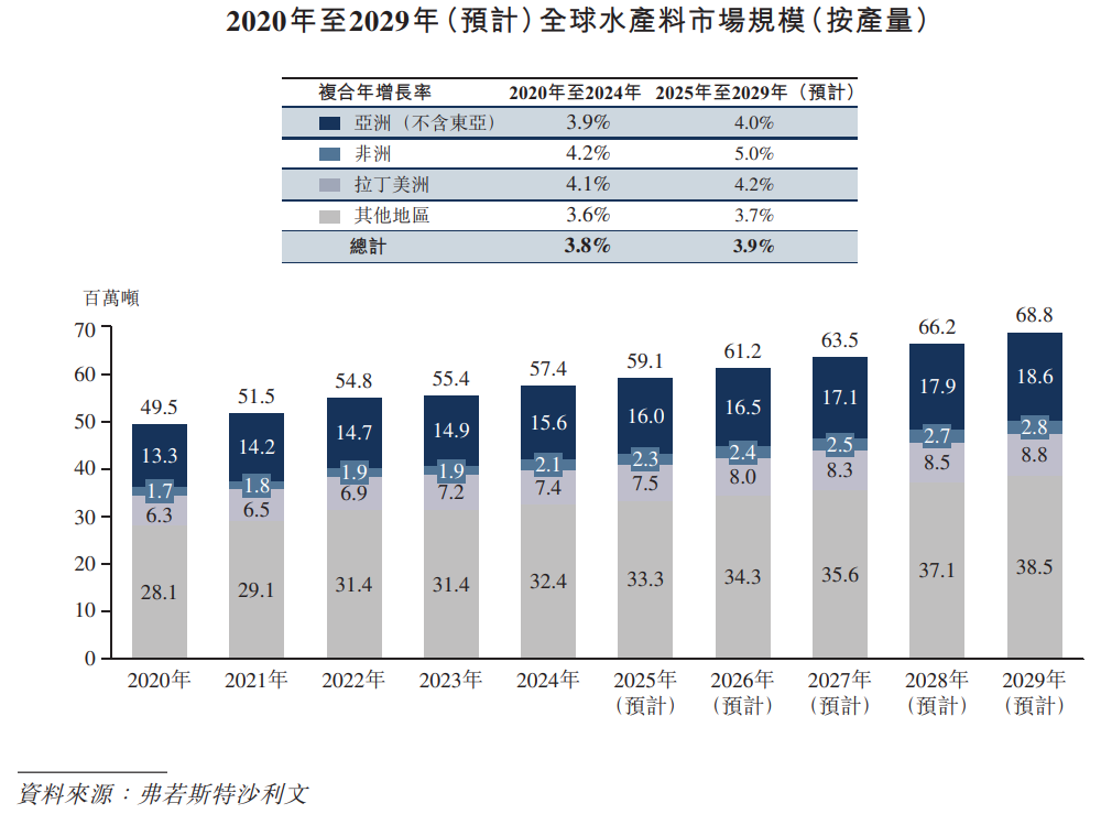 根据弗若斯特沙利文(Frost & Sullivan)报告,亚洲(不含东亚)水产料市场规模由2020年的13.3百万吨增加至2024年的15.6百万吨,并预计于2029年达到18.6百万吨,2025年至2029年的复合年增长率为4.0%。