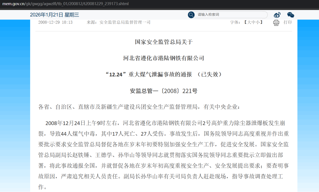 国家安全监管总局关于河北省遵化市港陆钢铁有限公司“12.24”重大煤气泄漏事故的通报(https://www.mem.gov.cn/gk/gwgg/agwzlfl/tb_01/200812/t20081229_239173.shtml)