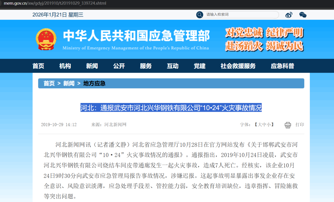 安监总局:河北:通报武安市河北兴华钢铁有限公司“10•24”火灾事故情况(https://www.mem.gov.cn/xw/gdyj/201910/t20191029_339724.shtml)