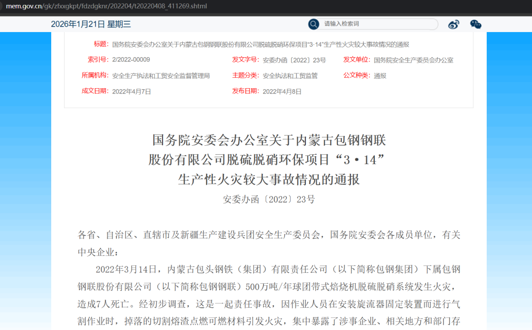 国务院安委会办公室关于内蒙古包钢钢联股份有限公司脱硫脱硝环保项目“3·14”生产性火灾较大事故情况的通报 安委办函〔2022〕23号(https://www.mem.gov.cn/gk/zfxxgkpt/fdzdgknr/202204/t20220408_411269.shtml)