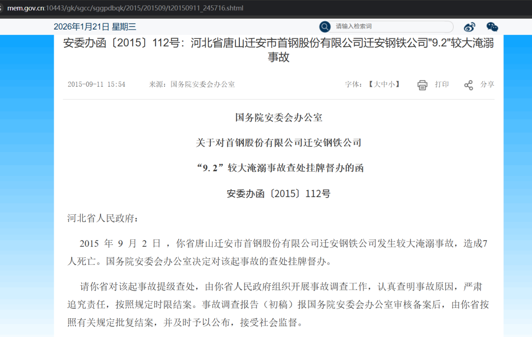 安委办函〔2015〕112号:河北省唐山迁安市首钢股份有限公司迁安钢铁公司"9.2"较大淹溺事故(https://www.mem.gov.cn:10443/gk/sgcc/sggpdbqk/2015/201509/t20150911_245716.shtml)