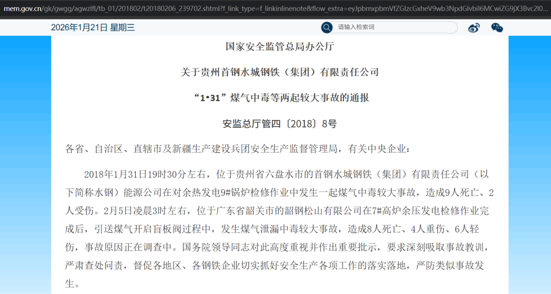 国家安全监管总局办公厅关于贵州首钢水城钢铁(集团)有限责任公司“1•31”煤气中毒等两起较大事故的通报 安监总厅管四〔2018〕8号(https://www.mem.gov.cn/gk/gwgg/agwzlfl/tb_01/201802/t20180206_239702.shtm)