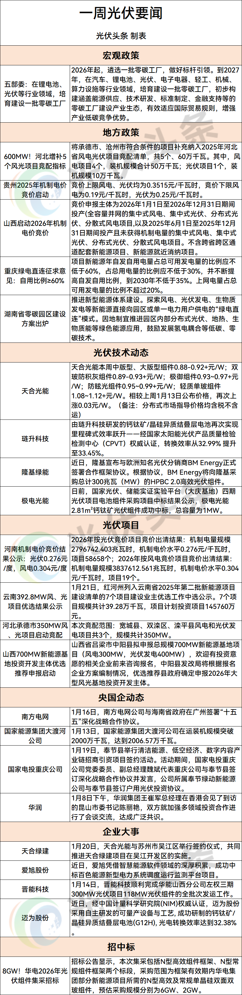1月16日,国网山西省电力有限公司发布2026年山西省增量新能源项目机制电价竞价组织公告。公告指出,竞价申报主体为2026年1月1日至2026年12月31日期间投产(全容量并网的集中式风电、集中式光伏、分布式光伏、分散式风电项目,以及2025年6月1日至2025年12月31日期间投产且未获得机制电量的集中式风电、集中式光伏、分布式光伏、分散式风电项目。不含跨省跨区通道配套新能源项目、新能源就近消纳项目。(来源:国网新能源云)