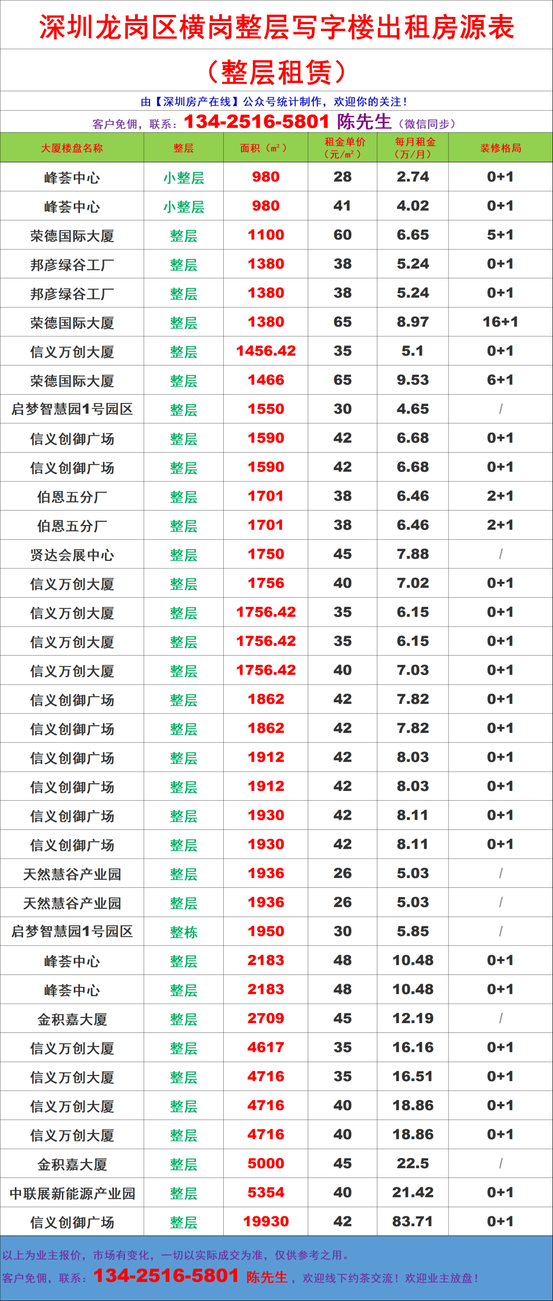 龙岗横岗地铁沿线写字楼办公室出租房源信息表&租金价格表