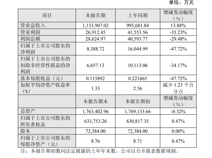 但盈利端表现不佳。除归母净利润下滑47.72%外,公司营业利润同比下降35.23%至2.69亿元,利润总额下降29.48%至2.86亿元,基本每股收益同步下滑47.72%至0.1159元/股,加权平均净资产收益率降至1.33%,较上年减少1.23个百分点。资产状况方面,报告期末公司总资产176.34亿元,同比微降0.32%;归属于上市公司股东的所有者权益63.38亿元,同比增长0.47%,整体资产结构保持稳定。