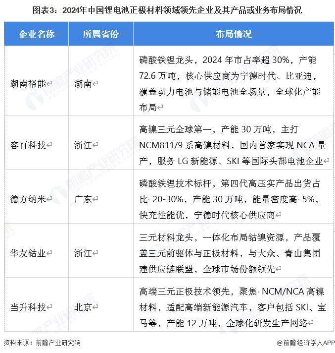中国锂电正极材料呈龙头主导格局,湖南裕能、容百科技、德方纳米等领跑,LFP与三元高镍路线并行,竞争聚焦技术迭代、产能扩张与成本控制,产能及市占率全球领先。企业具体布局情况如下: