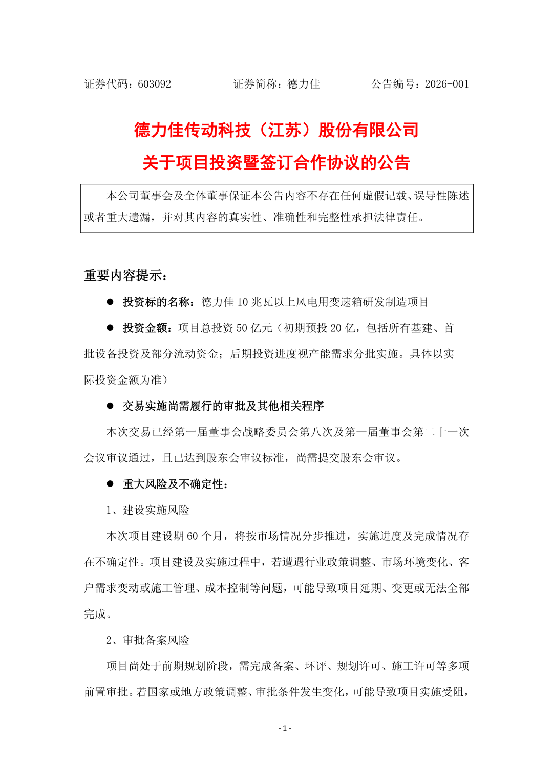风芒能源获悉,1月26日,德力佳传动科技(江苏)股份有限公司(以下简称“德力佳”)发布《关于项目投资暨签订合作协议的公告》。