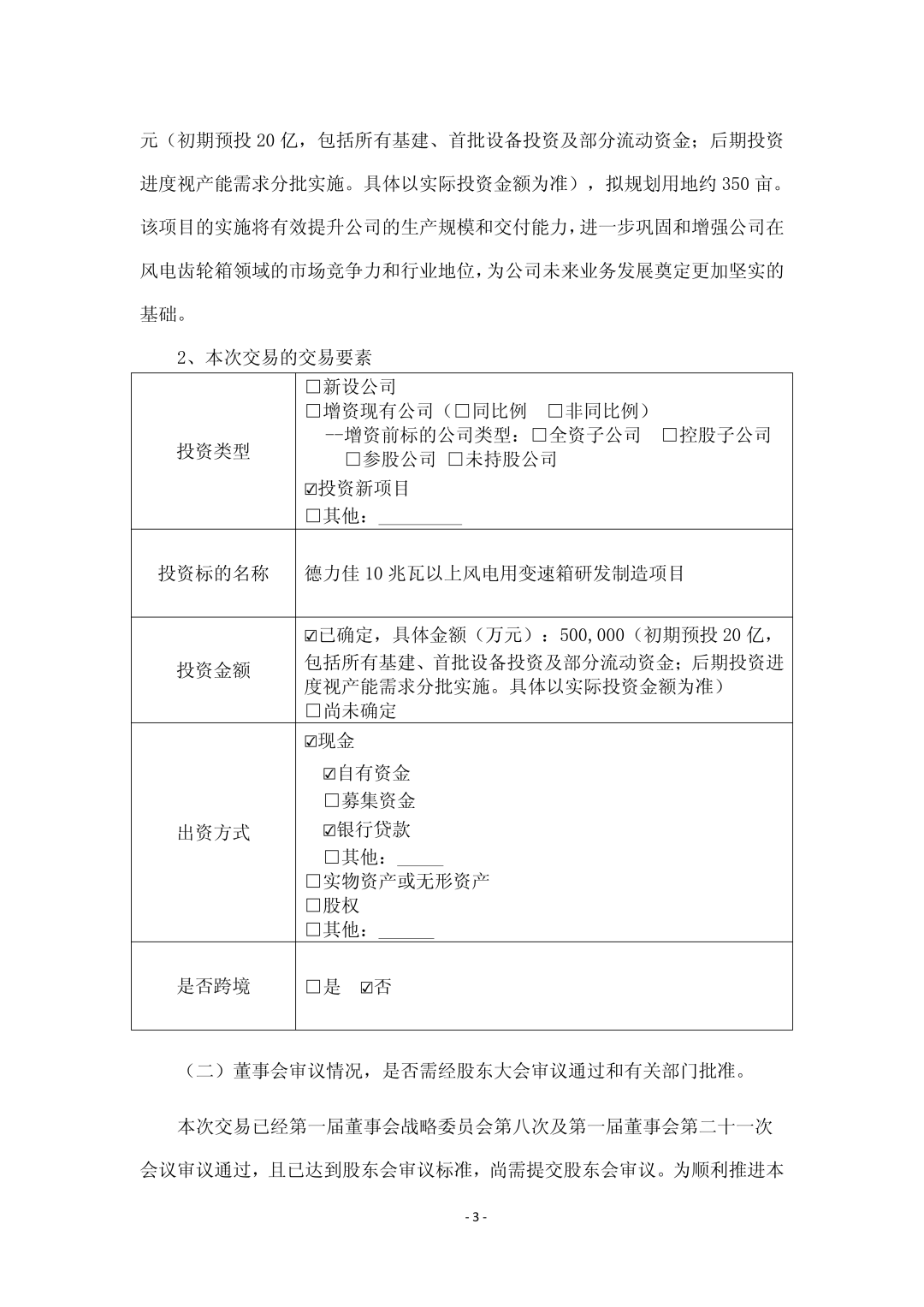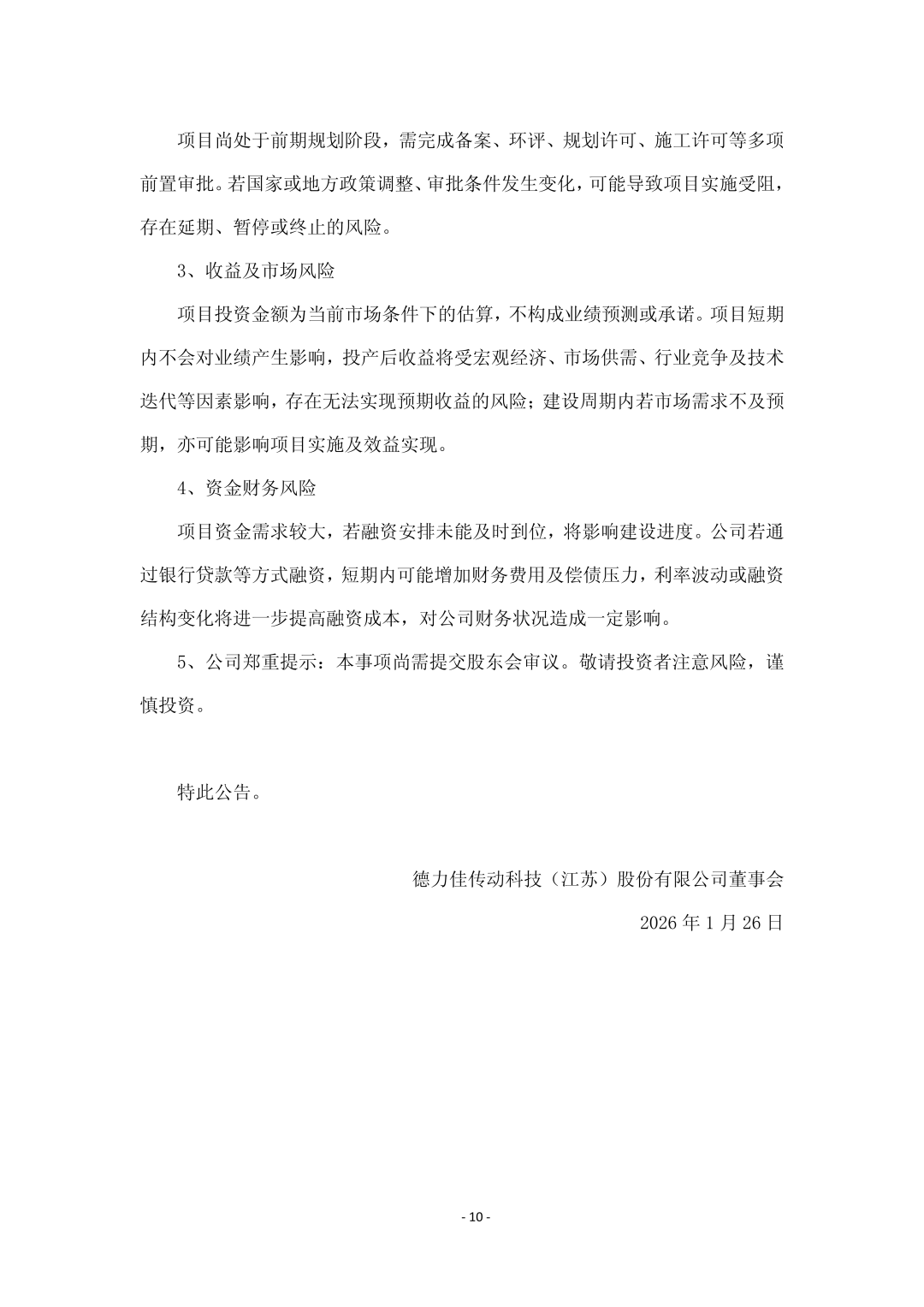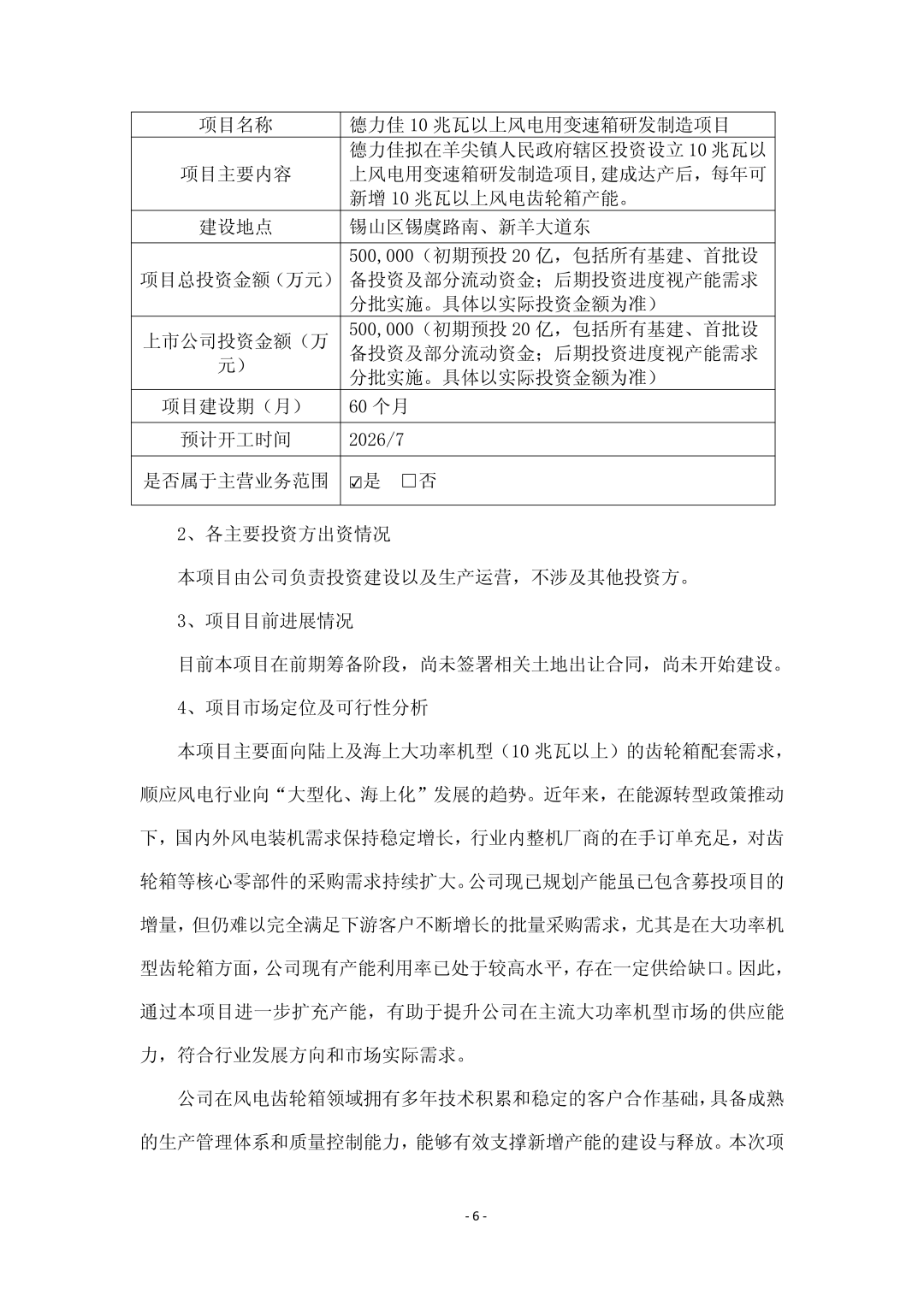 公告还指出,德力佳10兆瓦以上风电用变速箱研发制造项目”是公司围绕风电齿轮箱主业实施的一项产能扩充与产业升级类投资项目。项目主要面向10兆瓦及以上陆上和海上大功率风电装备市场,通过建设相关研发与制造设施,为公司在大型化、高性能风电变速箱领域的业务发展提供支撑。项目将根据公司整体战略和市场需求逐步推进,为后续进一步优化产品结构和扩大生产能力创造条件。