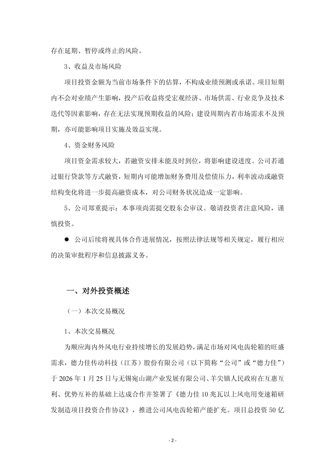 公告指出,为顺应海内外风电行业持续增长的发展趋势,满足市场对风电齿轮箱的旺盛需求,德力佳于2026 年1月25日与无锡宛山湖产业发展有限公司、羊尖镇人民政府在互惠互利、优势互补的基础上达成合作并签署了《德力佳10兆瓦以上风电用变速箱研发制造项目投资合作协议》,推进公司风电齿轮箱产能扩充。