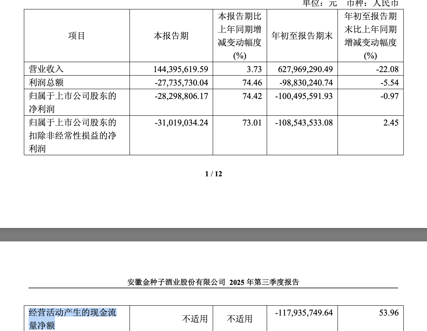2021年-2024年,金种子酒归母净利润分别亏损1.66亿元、1.87亿元、0.22亿元和2.58亿元,四年累计亏损超6.33亿元。2025年前三季度,公司实现营业收入6.28亿元,同比下降22.08%,归母净利润亏损1亿元,同比基本持平。