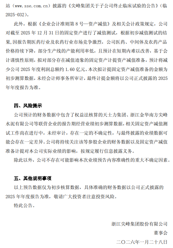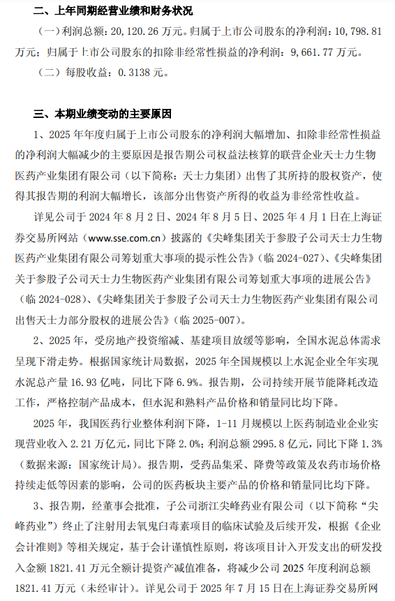 2026年1月28日,尖峰集团发布2025年年度业绩预告显示,公司预计2025年年度实现归属于上市公司股东的净利润4.6亿元左右,与上年同期相比,将增加3.52亿元左右,同比增加325.97%左右;预计2025年年度实现归属于上市公司股东的扣除非经常性损益的净利润-21.5亿元左右,与上年同期相比,将减少 3.12亿元左右,同比减少322.53%左右。