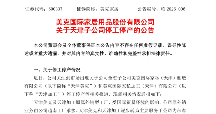 美克家居天津工厂的停工停产,是行业周期与企业经营困境交织的结果。据最新消息,公司虽于1月13日通过政府监管账户结清2025年全部欠薪,取消争议性的“现金+家具抵薪”方案,但按司龄计算的经济补偿尚未兑付,工厂正评估破产清算事宜,员工后续权益面临不确定性。