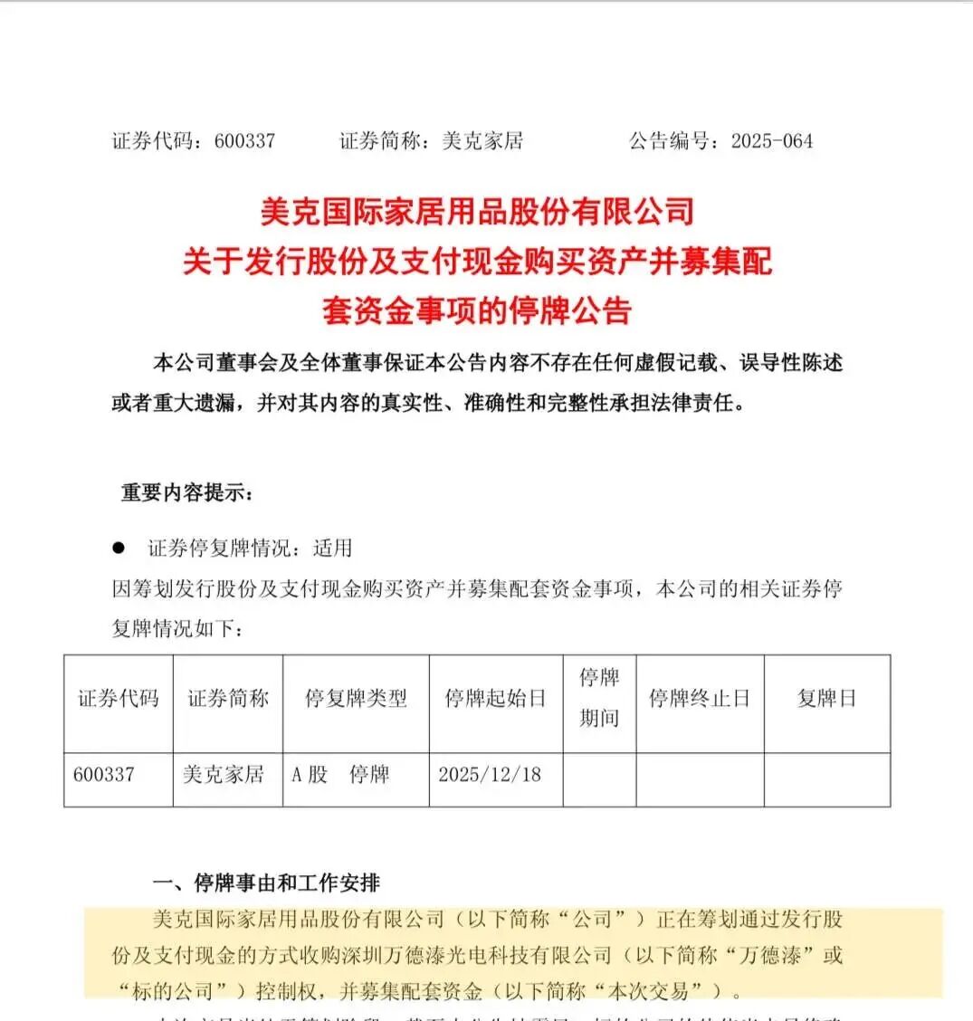 与经营端的惨淡形成鲜明对比,美克家居股价的暴涨源于一场跨界转型的预期。2025年12月31日,公司披露重组预案,拟通过发行股份及支付现金方式收购深圳万德溙光电100%股权,切入AI算力基础设施领域,这一举措瞬间点燃市场热情。