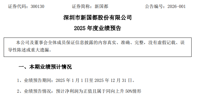 1月27日晚间,嘉联支付母公司新国都披露了2025年度业绩预告,预计2025年归母净利润4亿元至5亿元,同比增长70.79%-113.49%;扣非净利润预计3.5亿元-4.5亿元,同比下降8.6%-28.91%。