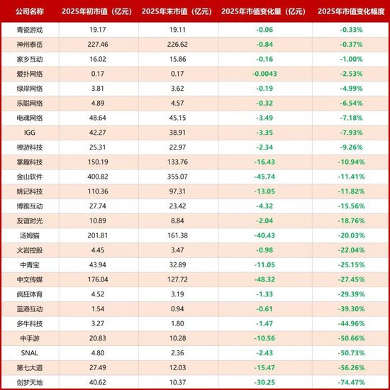 2025年,我们可以看到依旧有25家游戏公司市值下跌,中手游、创梦天地等公司跌幅超过50%。