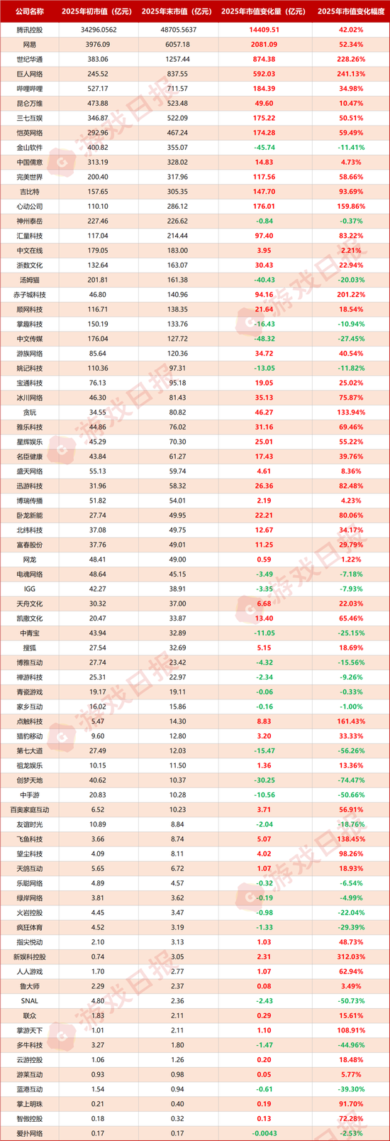 增长量最大的依旧是腾讯,整个2025年市值增长了1.44万亿元(换算人民币后),其次是网易增长量超过2000亿元。在2025年备受关注的世纪华通和巨人网络则分别位列第三、四位。