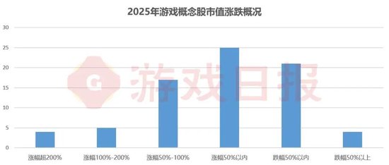 我们整理汇总了76家游戏上市公司在2025年市值变化情况,根据统计有超过三分之二的公司市值在2025年呈现增势,其中涨幅超过200%的达到4家,三分之一的公司涨幅超过50%。
