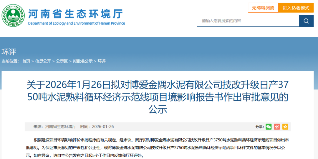 2026年1月26日,河南省生态环境厅公示拟对博爱金隅水泥有限公司技改升级日产3750吨水泥熟料循环经济示范线项目环评文件作出审批意见,公示期5个工作日。