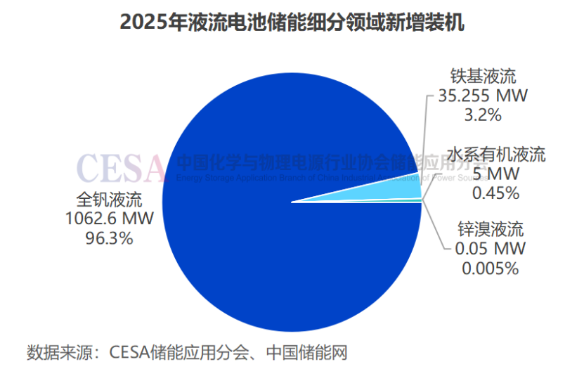 据CESA储能应用分会产业数据库统计,2025年,中国液流电池储能新增装机1.1GW/4.66GWh,同比增长36.7%(功率)/44.5%(容量),占比1.7%(功率)/2.4%(容量)。